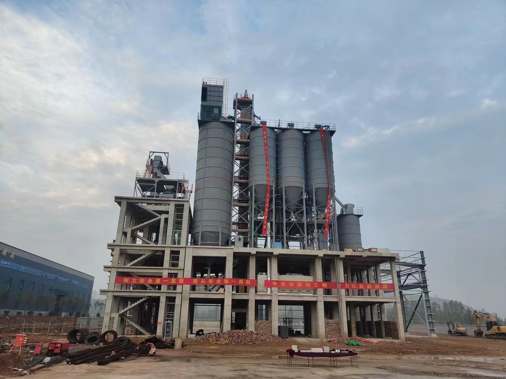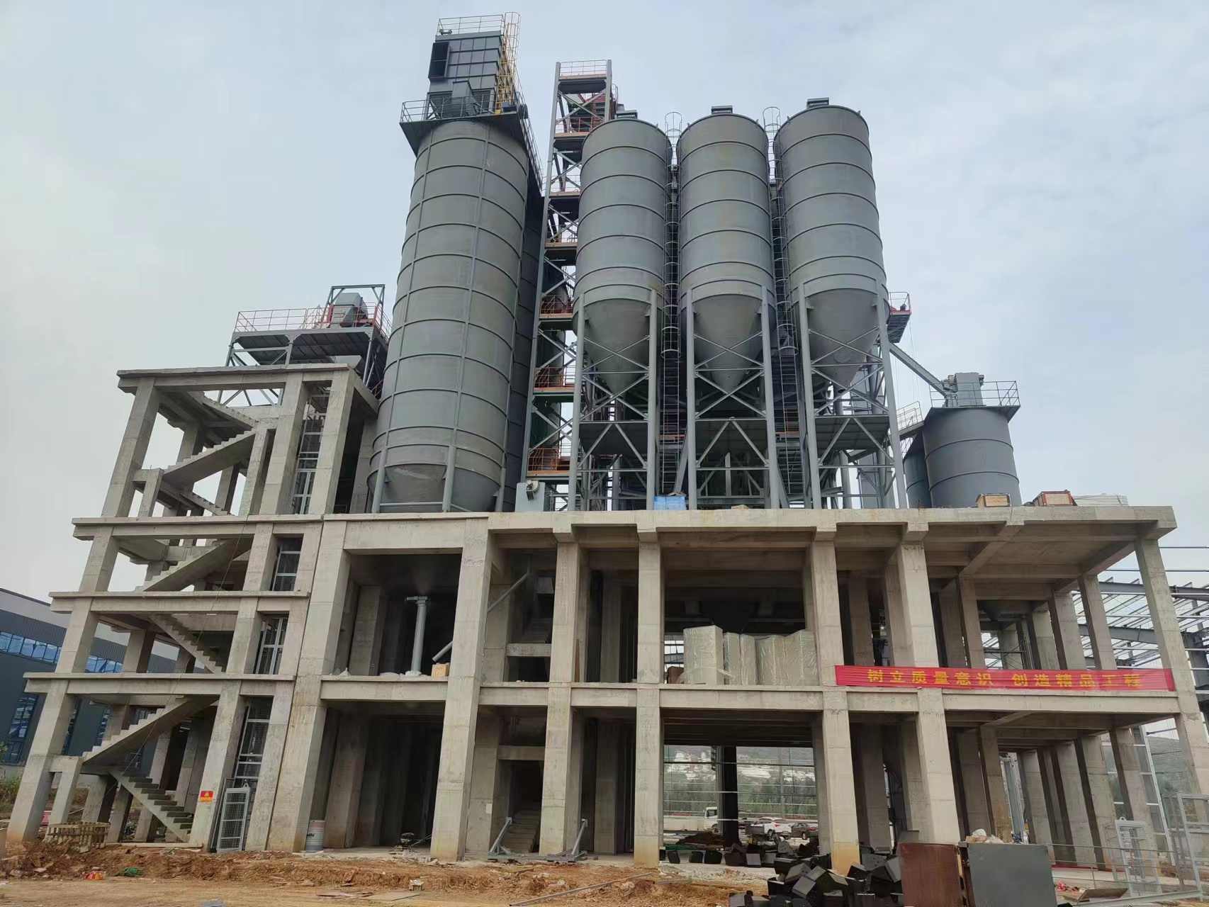 塔樓式干粉砂漿生產(chǎn)線:適合大規(guī)模生產(chǎn),生產(chǎn)品種多,效率高,運行成本低,產(chǎn)量大,結(jié)構(gòu)緊湊,占地面積小。