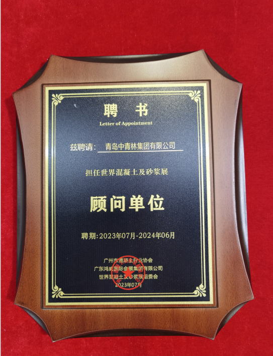 中青林重工喜獲世界混凝土及砂漿展顧問單位榮譽稱號